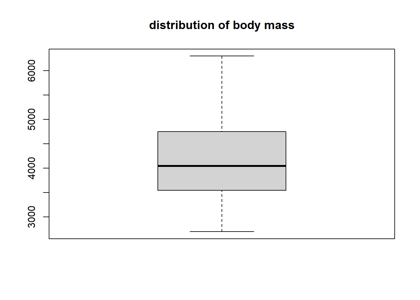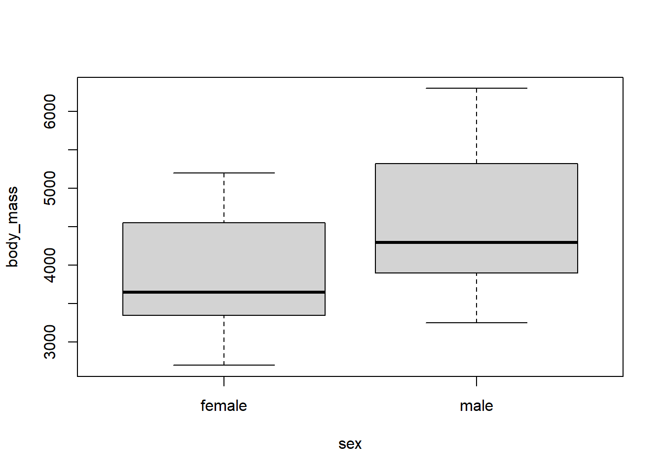 Once again use the plot function with a formula, we can create a parallel box plot easily, with the syntax of the formula being numeric variable ~ factor variable (you can reverse these to change the box plot orientation). We parallel box plots of body_mass versus sex below.