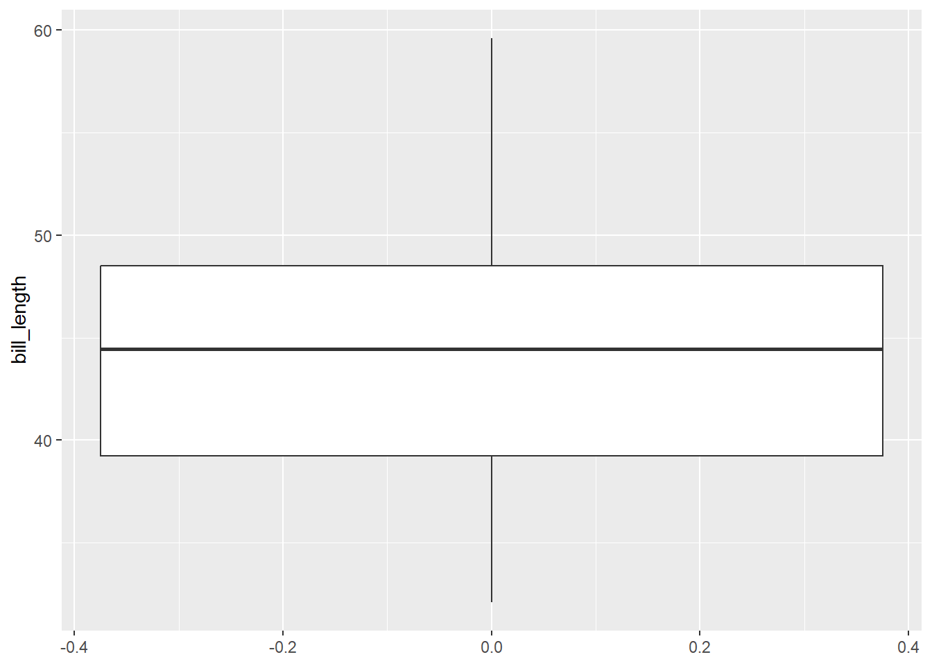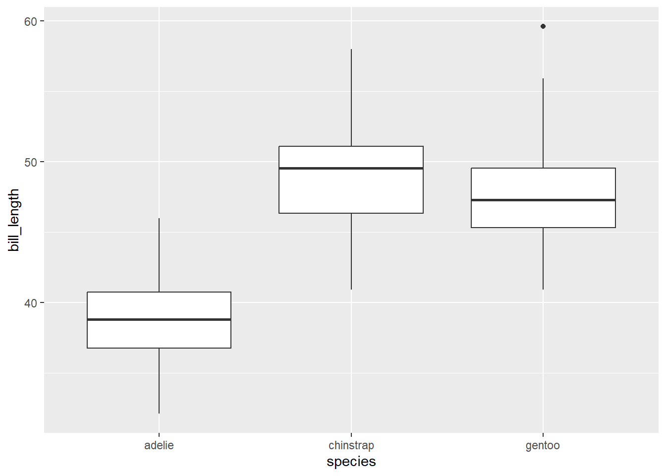 We can produce something similar with ggplot2 by specifying both the y and x aesthetics of for geom_boxplot. We do so below to compare bill_length for the different penguin species.