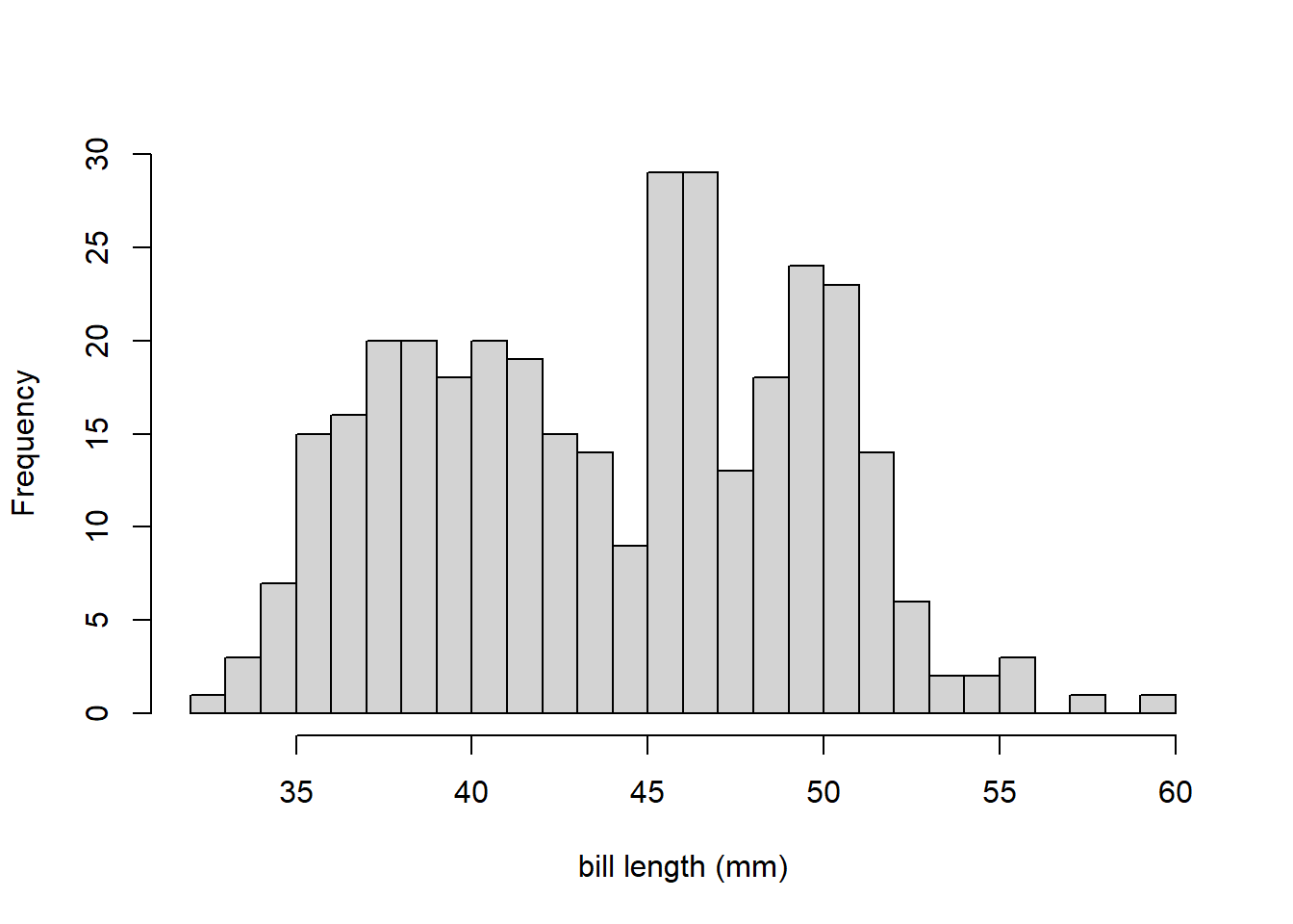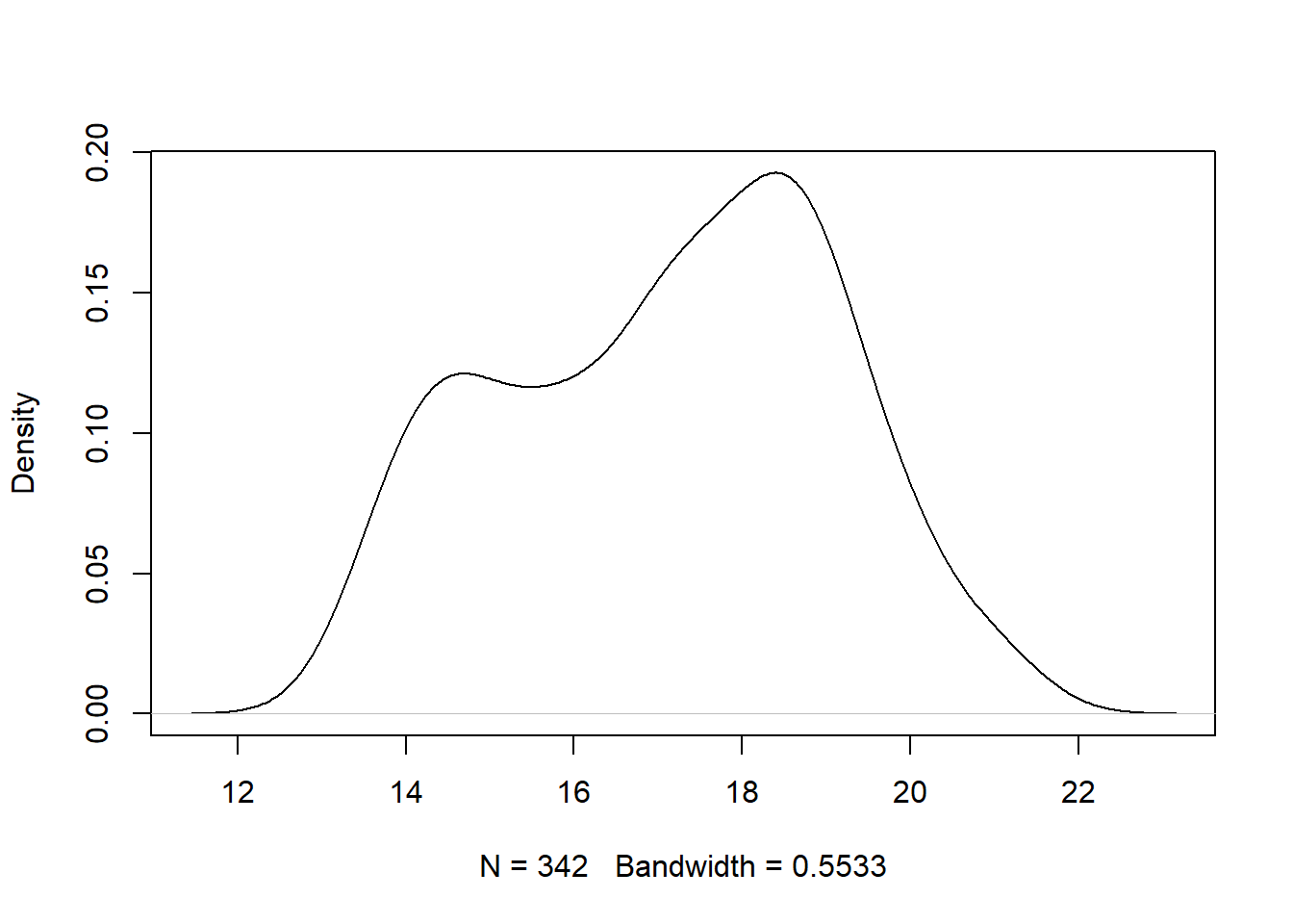 The bill_depth variable is bimodal with peaks around 14 mm and 18 mm. The graphic also indicates that 342 observations were used to estimate the density and the bandwidth parameter was 0.5533. The bandwidth parameter controls the amount of smoothing and can be changed. Run ?stats::density in the Console for more details.