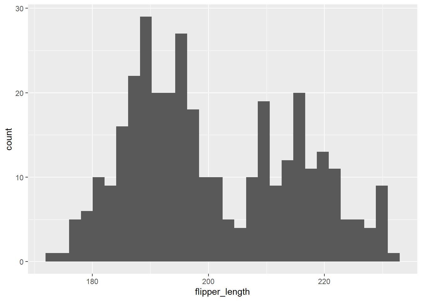 Flipper length is also bimodal, with prominent peaks approximately centered around 190 and 220 mm.