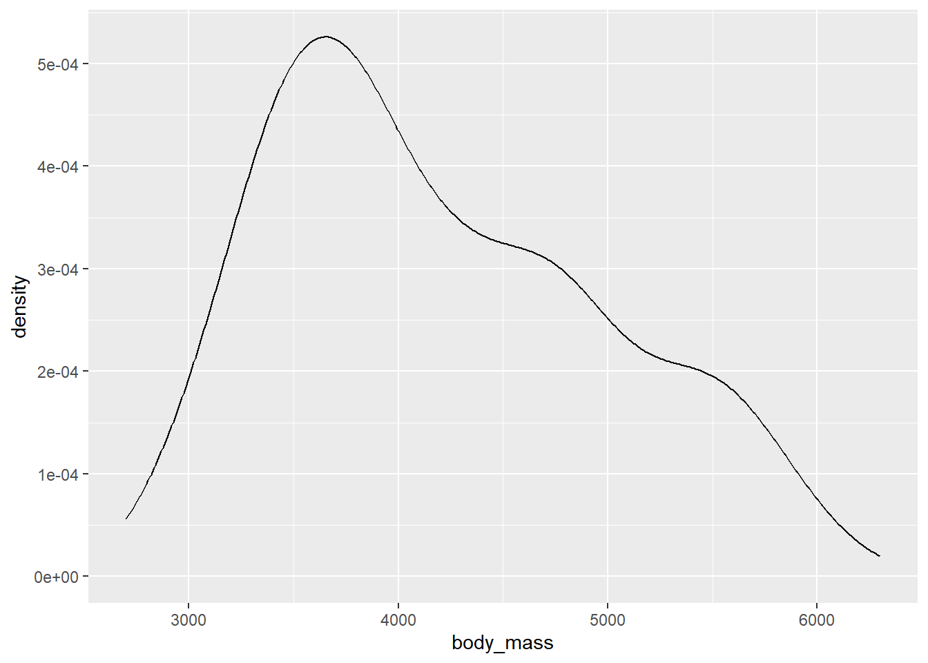 We create a density plot with ggplot2 using geom_density. We do so for the body_mass variable, mapping it to the x aesthetic.