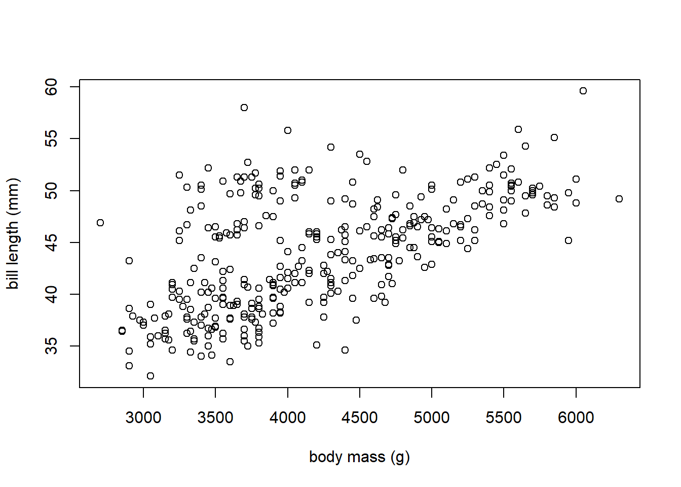 We use the plot function to create a scatter plot of bill_length versus body_mass (the y variable versus the x variable) using base R below. The plot function is very flexible and can be used multiple ways to produce a scatter plot, but we will use the formula method that takes a formula describing the variables (y ~ x) and the data frame from which the variables come.