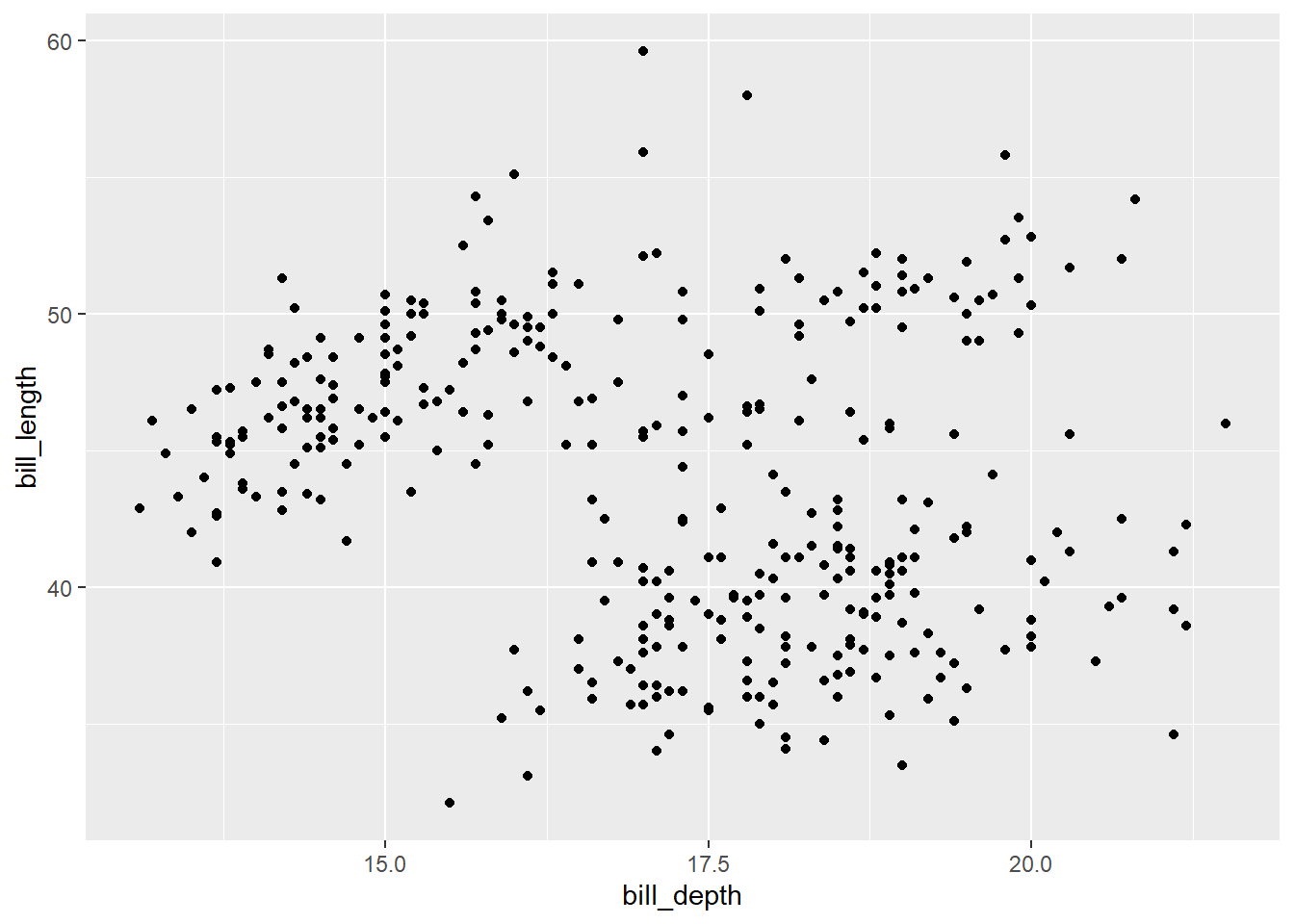 geom_point(aes(x = bill_depth, y = bill_length)) +
