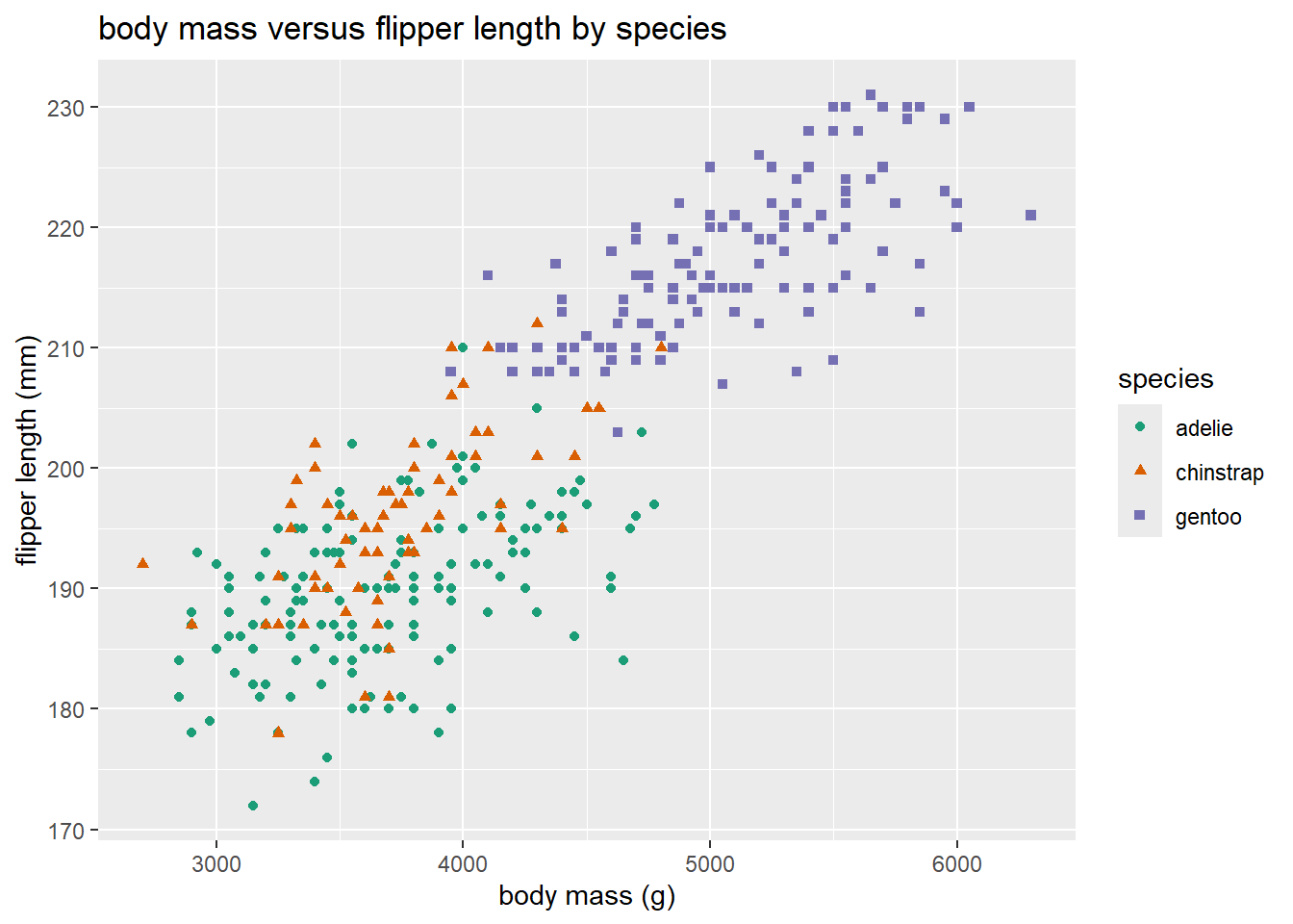 xlab("body mass (g)") + ylab("flipper length (mm)") +