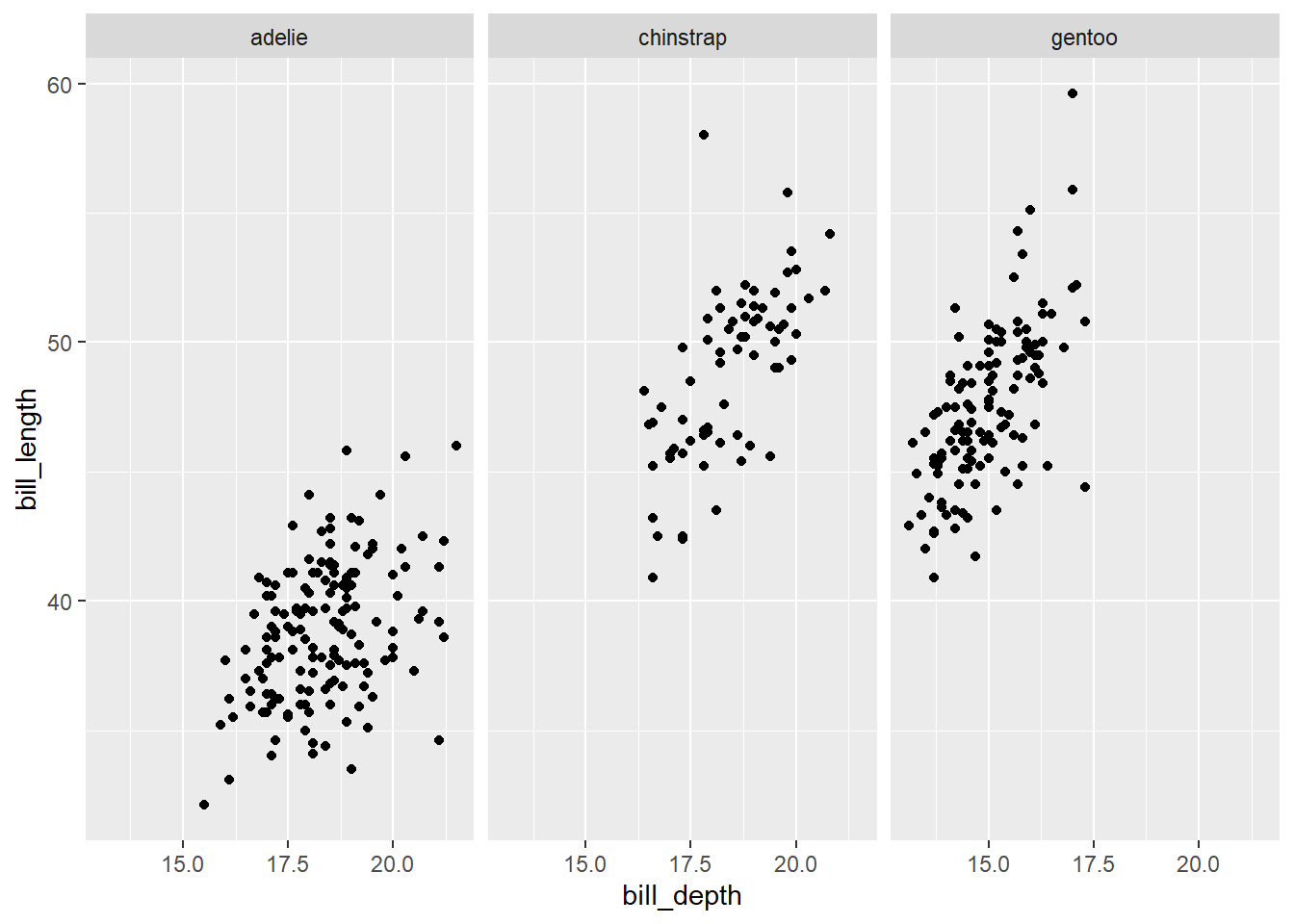Whereas we previously couldn’t discern a relationship between bill length and depth based on a single scatter plot, facetting by species makes it clear there is a positive relationship between bill_length and bill_depth. We could have used a group scatter plot for the same thing.