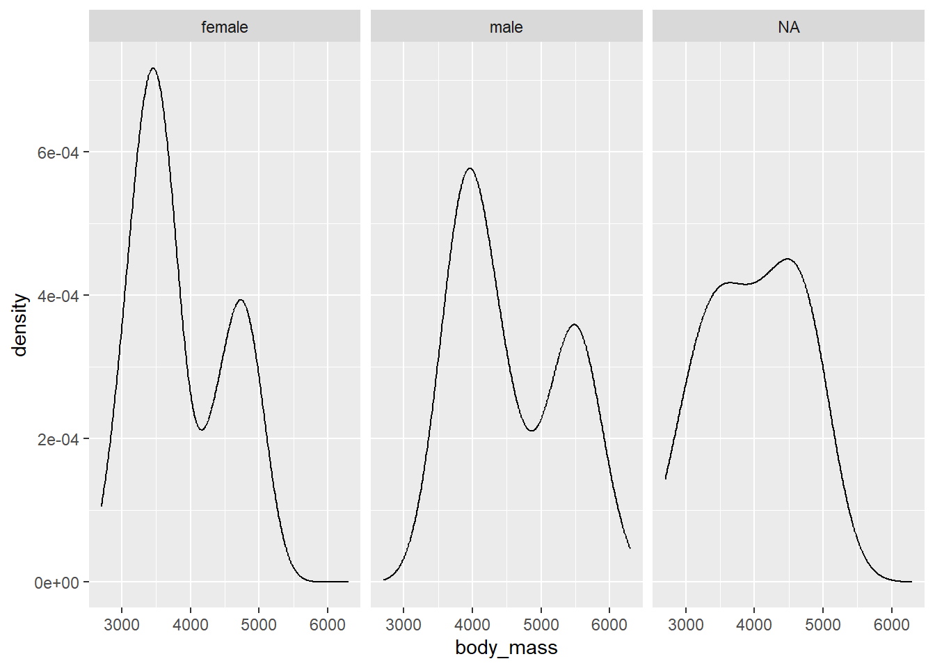 A simpler facetting example would be to facet density plots of body_mass by sex as shown below.