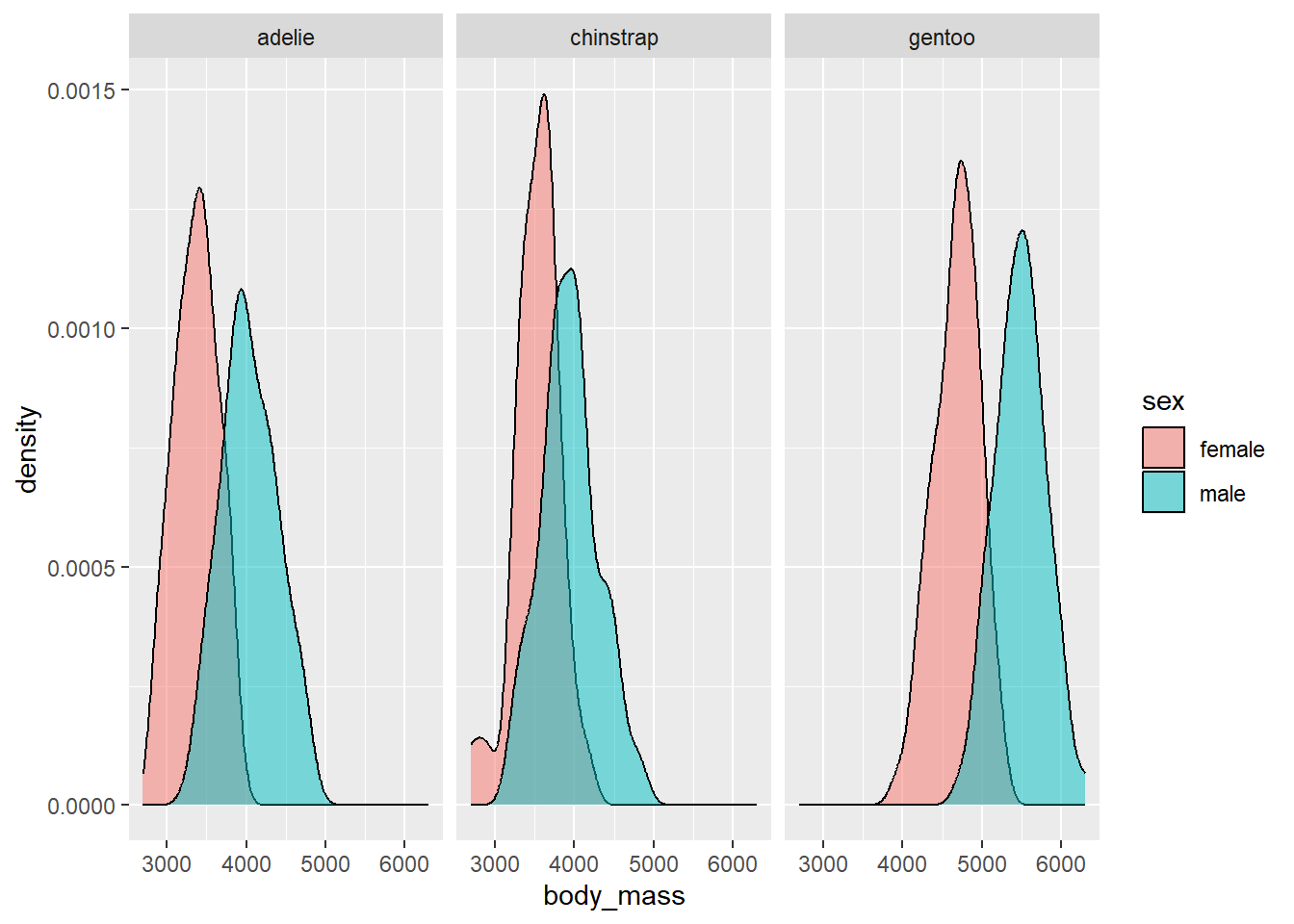 In the next plot, we create density plots of the body_mass variable. However, we use the fill aesthetic to scale the sex variable so that the we distinguish the densities of male and female penguins with different colors. We set the alpha argument to 0.5 OUTSIDE the aes function (because it is being manually specified) so that the colors are translucent and blend. We also facet by species to see what the patterns look like for the different species.